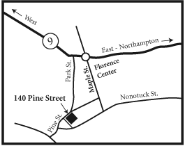From the Center of Downtown Northampton, follow Main Street/Rt. 9 West towards Florence Center. Stay on it for about 1 mile. (Landmarks: on your right, pass these streets: Franklin, Massasoit and Woodlawn). Just after Woodlawn, turn Left onto Elm Street (Landmarks: High School on your left and Childs Park on your right). Continue on Elm Street which becomes Nonotuck Street for 1.4 miles. Turn Right on Corticelli Street, continue to the end of the street. Turn Right on Pine Street. The Florence Community Center is immediately on your right. Follow Pine Street to the driveway at the far corner of the building. Parking is available at the rear of the building.